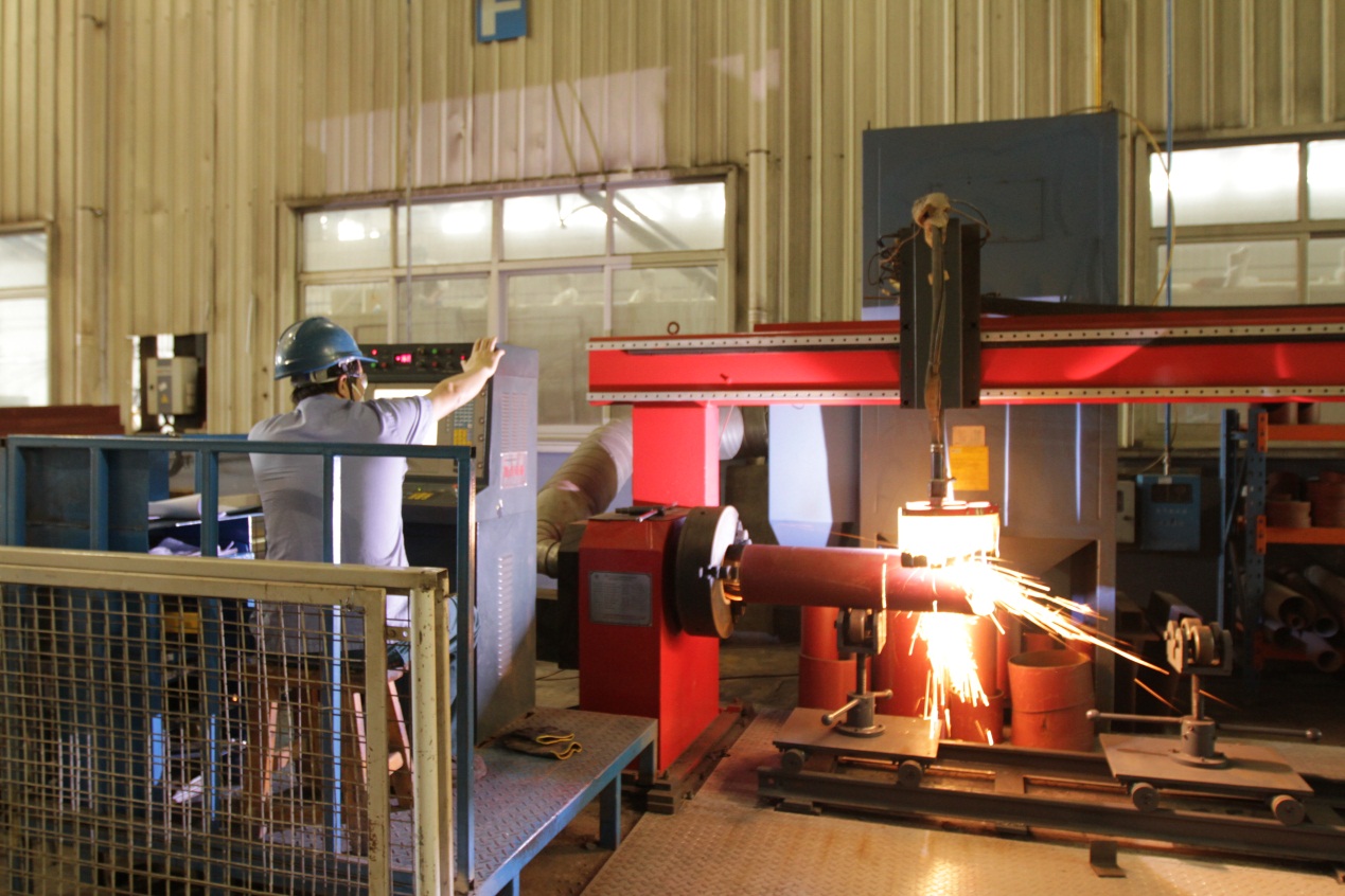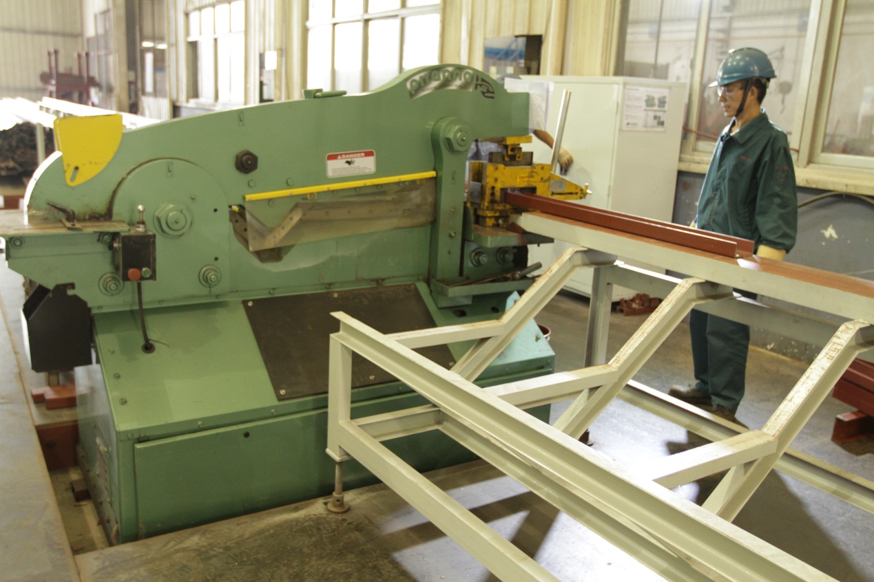 型材数控下料生产线,采用进口数控龙门大型自动送料带锯床、数控相贯线等离子切割机、液压高速圆锯机、水虎鱼多功能冲剪机等设备,完成型材的下料生产与成型制作。应用数控自动化机械设备,大幅度提高型材断面精度高,保证质量。