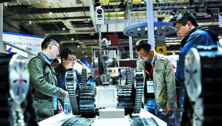 本届中国工博会重点推介的机器人——中信重工研制的重型磨机换衬板智能机器人吸引了众多与会者驻足观看。除此之外,中信重工机器人家族的其他成员——履带式机器人、灾区侦测机器人、水下机器人、巡检机器人、管道机器人,以及互联网咖啡机器人、自然光苹果分拣机器人等,也成为展会追捧的“明星”。