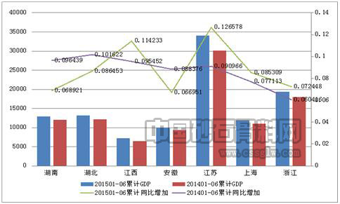 从区域内地方生产总值情况来看,长江中下游流域各省市实际表现与表观感知存在着较大的出入。湖北、湖南及安徽三地2015年上半年GDP增速同比全面下滑,降幅多在2-3个点,经济下行趋势明显,这与年初部分研究结构给出的9%以上的增速预测严重背离,这种乐观的预测始于国家关于长江流域未来发展的战略定位,2014年9月,国务院刊发文件——《关于依托黄金水道推动长江经济带发展的指导意见 国发〔2014〕39号》,明确提出要借助黄金水道优势,打造长江经济带新增长极。2015年4月该区域又一重磅消息落地,国务院正式批复《长江中游城市群发展规划》,这意味着继长三角、京津冀、珠三角之后,又一国家级战略城市群浮出水面。但从实际情况来看,政策助力依然停留在概念阶段,区域经济建设效力还未发挥出来。