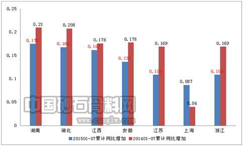 固定资产投资是经济增长的重要引擎,是一个国家经济增长的前提保证,和基础建设材料行业发展密切相关,是社会增加固定资产、扩大生产规模、发展国民经济的重要手段,也是提高人民物质文化生活水平的条件。但从区域内固定资产投资增速变化来看,表现不容乐观。2015年1-7月固定资产投资累计增速,除上海市同比增加外,湖南、湖北、江西、安徽、江苏及浙江全面下滑,降幅最大的高达6%,投资乏力萎缩现象明显,预计短期内无法回暖,颓势或将进一步持续至年底。