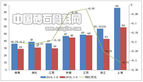 图5 长江流域部分省市骨料离岸均价及同比变化(单位:万吨)