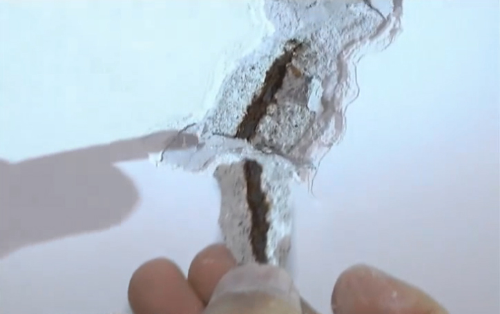 从剥落的天花板表皮上可以清晰地看到钢筋腐蚀的痕迹