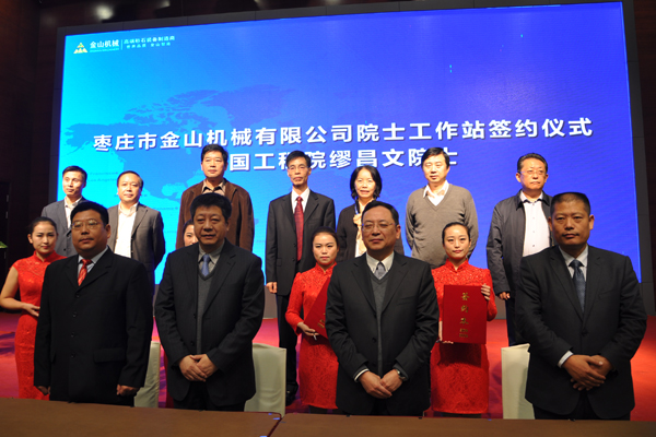 金山机械为了更好地推动高品质骨料与高性能混凝土成套技术、建筑废弃物与尾矿资源化的研究与应用,依托中国工程院缪昌文院士创新团队在现代混凝土领域的卓越成果和深厚底蕴,联合北京建筑大学宋少民教授在高品质骨料、绿色高性能混凝土领域的学术和技术优势,以金山机械公司在机制砂石骨料先进的生产和制造技术为主体,嫁接北京百旺科技在高品质机制砂石装备技术的研发、设计、应用的经验与实力,四方强强联手,在枣庄市金山机械成立院士工作站。对高品质骨料关键技术研究、高性能混凝土成套技术研究、高品质骨料生产装备技术研究等三方面进行深入研究。金山机械院士工作站的成立将助推枣庄市机械装备千亿产业集群的飞跃,全面加快金山机械的研发进程。