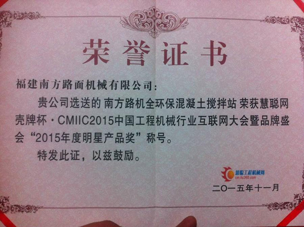 11月9日,以“破局新常态 赢享中国”为主题的壳牌杯?CMIIC 2015中国工程机械行业互联网大会暨品牌盛会于湖南长沙隆重举行。此次大会上,南方路机全环保混凝土搅拌站在参评的众多产品中经过层层考核脱颖而出,荣获CMIIC2015“明星产品奖”。