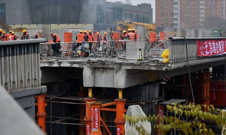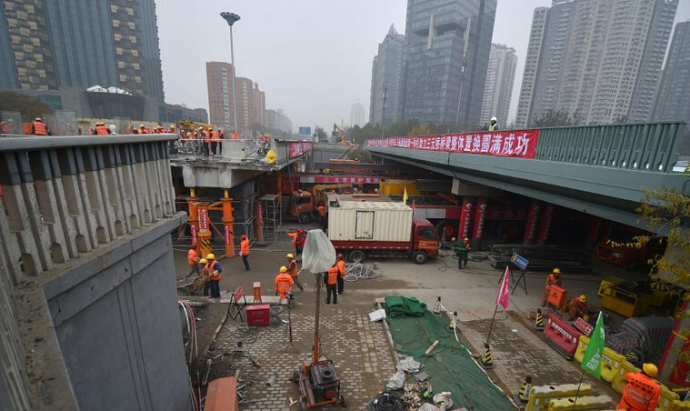据报道,13日23点,三元桥更换“桥面”工程正式启动,记者从北京市交通委获悉,约14日上午8点20分新桥就位,后续工程及沥青路面恢复要持续至14日深夜23点。据了解,这是全国首次在城市重要节点实施此类换桥工法。