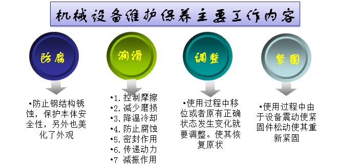 据调查,机器设备故障60%是润滑不良引起的,30%是紧固不到位引起的,基于这两种情况,机械设备日常的维护保养要点着眼于:防腐、润滑、调整、紧固。