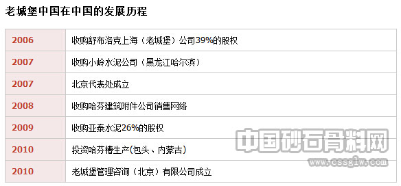 CRH从2004年开始积极着手开展对中国市场的调查,2007年直接收购小岭水泥公司。随后2009年1月收购亚泰集团水泥业务26%的股权。通过对舒布洛克建材有限公司和哈芬建筑附件公司的直接收购,获取了其他建筑产品的生产业务。从2010年开始投资方向定位于内蒙古的生产领域。2007年老城堡中国代表处成立。2010年4季度全资子公司—— 老城堡管理咨询(北京)有限公司成立。