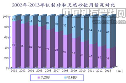 2010年以来,我国砂石行业的发展趋势和业态变化很大,机制砂石生产比重迅速上升。砂石工业企业的传统生产天然砂的比重从2002年的90%下降为2005年的80%,2010年机制砂产量比重达到50%,比2005年提高30个百分点。直至2013年,机制砂产量比重达到76%。
