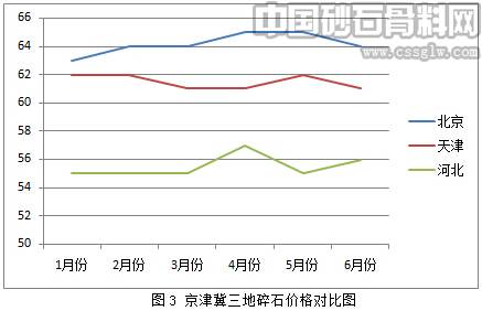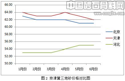 图2和图3分别为今年上半年京津冀三个省市的砂和碎石的价格对比图,由对比结果可以看出,京津地区价格较为接近,而河北地区价格较京津地区低10元左右。分地区来看,今年1-6月,北京地区碎石价格在三地中居于首位,而砂的价格略低于天津,碎石和砂的价格(注:本文中砂石骨料价格均为到岸价格)分别在64元/吨和62元/吨左右浮动;天津与北京相邻,并与北京一起被河北环绕,两地砂石主要由河北地区供应,所以砂石价格基本一致,只是略有偏差,天津地区碎石和砂的的价格分别在61.5元/吨和63元/吨左右浮动;由于河北省各市砂石资源较丰富,与京津相比运输成本较低,故砂和碎石的价格最低,分别为55.5元/吨和54元/吨,虽然6月份有轻微上涨,但幅度不大。随着京津冀一体化具体项目的落地,笔者预计未来几个月内京津冀地区的砂石价格将可能有小幅上升,但因今年春节以来南方大部地区砂石价格持续走低,京津冀地区砂石价格即使上涨,涨幅不会太大。