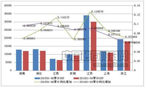 从区域内地方生产总值情况来看,长江中下游流域各省市实际表现与表观感知存在着较大的出入。湖北、湖南及安徽三地2015年上半年GDP增速同比全面下滑,降幅多在2-3个点,经济下行趋势明显,这与年初部分研究结构给出的9%以上的增速预测严重背离,这种乐观的预测始于国家关于长江流域未来发展的战略定位,2014年9月,国务院刊发文件——《关于依托黄金水道推动长江经济带发展的指导意见 国发〔2014〕39号》,明确提出要借助黄金水道优势,打造长江经济带新增长极。2015年4月该区域又一重磅消息落地,国务院正式批复《长江中游城市群发展规划》,这意味着继长三角、京津冀、珠三角之后,又一国家级战略城市群浮出水面。但从实际情况来看,政策助力依然停留在概念阶段,区域经济建设效力还未发挥出来。