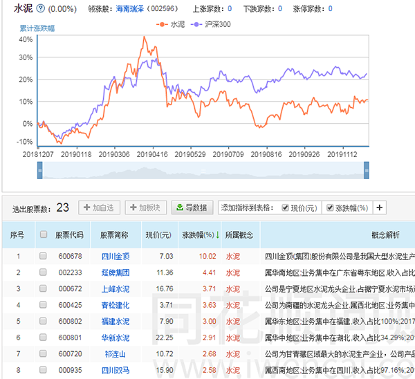 摘要:2019年12月9日,水泥板块全线上涨,截至下午三点,四川金顶涨停,塔牌集团涨幅超4%,上峰水泥、青松建化、福建水泥、华新水泥、祁连山等跟涨。