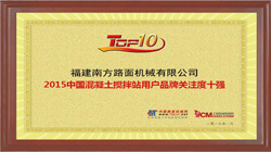 南方路机第五次获中国混凝土搅拌站用户品牌关注度十强